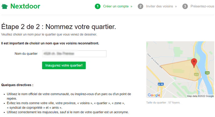« Minimum/maximum », car si on dépasse un certain nombre d’adresses, Nextdoor ne vous permet pas d’enregistrer notre périmètre et vous devez le rétrécir. C’est d’ailleurs la partie que j’ai trouvée la plus compliquée, car Nextdoor est plutôt avare d’explications quant à la façon de créer notre périmètre de voisins.