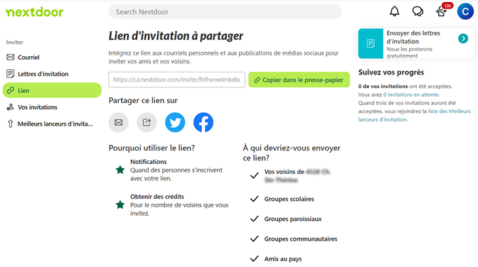 Ensuite, vous pourrez envoyer des invitations aux voisins que vous souhaitez joindre à votre groupe en leur envoyant une invitation par courriel ou par vos réseaux sociaux. Nextdoor vous fournit même un lien à copier et à coller dans vos invitations :