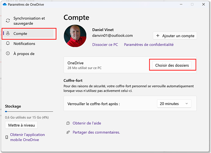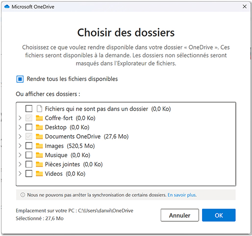Par ailleurs, certains dossiers ne peuvent pas être désélectionnés, tels que le dossier Coffre-fort, qui est un dossier sécurisé fourni par OneDrive et, bien entendu, le dossier Documents OneDrive lui-même, un reflet du dossier Documents que nous avons tous.