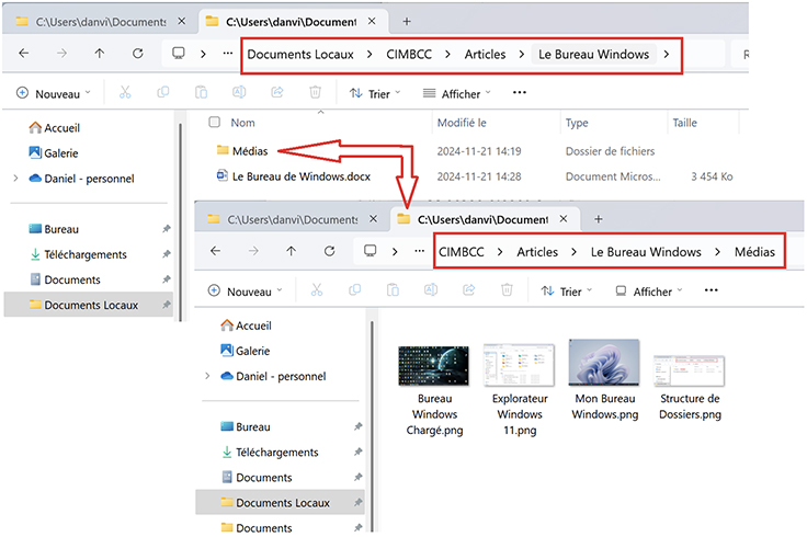 Ici, le dossier se nomme « Le Bureau Windows ». Ce dernier est un sous-dossier de « Articles » qui, lui-même, est sous-dossier de « CIMBCC ».