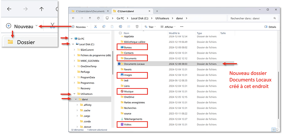 Dans un premier temps, nous allons créer un dossier au même niveau que notre dossier nommé Documents. Ce dernier est le dossier par défaut créé par Windows pour chaque utilisateur. Il est votre dossier généralement présenté lorsque vous sauvegardez des documents et celui qui est pris en sauvegarde par OneDrive.