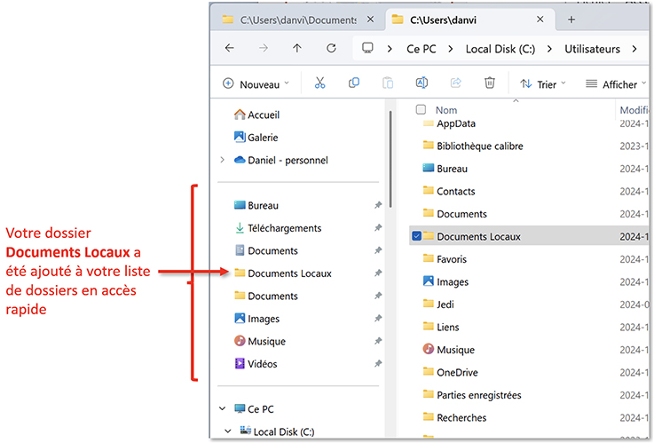 Pour ce faire, cliquez avec le bouton droit de la souris sur votre nouveau dossier Documents Locaux, puis choisir Épingler à l’accès rapide. Celui-ci s’ajoutera à votre liste dans la partie gauche de l’explorateur.