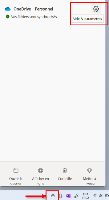 Pour vérifier les dossiers et fichiers pris en sauvegarde par OneDrive, dans votre barre des tâches au bas, à droite, cliquez avec le bouton gauche de la souris sur l’icône en forme de nuage que nous avons vu plus haut dans cet article, puis cliquez sur la roulette des paramètres dans le coin supérieur droit de la fenêtre qui apparaîtra et choisissez Paramètres.