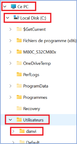 Le segment <Votre compte utilisateur> est votre dossier utilisateur à vous. Dans mon cas, le dossier se nomme danvi dans l’image ci-contre.
