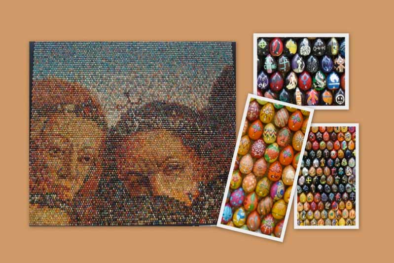 Une murale et parties de la murale montrant qu’elle est faite d’oeufs colorés