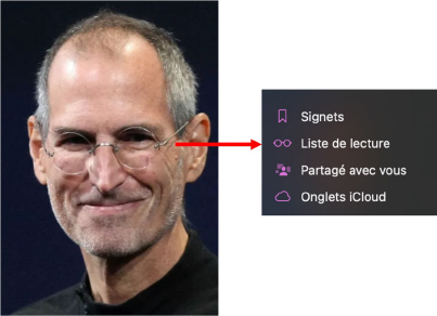 Par exemple, dans le navigateur Safari, sous IOS, iPadOS et macOS, en affichant la barre latérale, on constate que l’icône choisie pour représenter la Liste de lecture est une réplique des lunettes de Steve Jobs.