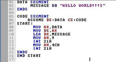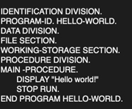 « Hello World! » en COBOL. Ceci est déjà beaucoup plus compréhensible, mais un peu lourd.