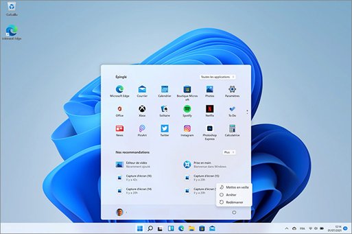 Cette version apporte son lot de changement au Windows Shell, nom de l’interface graphique de Windows. Ainsi, nous voyons encore une fois un menu « Démarrer » entièrement redessiné et toujours représenté par une icône du logo de Windows. Celui-ci est placé au centre de la barre de tâches plutôt qu’à gauche comme nous l’avons toujours connu. Rassurez-vous, il est toujours possible de le repositionner à gauche via les paramètres de configuration. Cette fois, les tuiles disparaissent pour de bon et sont remplacées par de simples icônes.