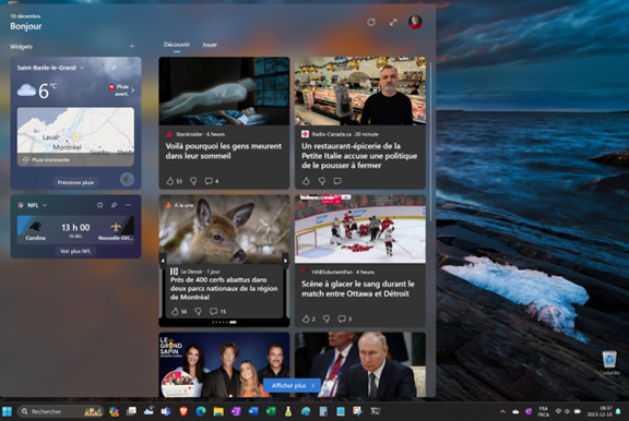 Un panneau de Widgets fait son apparition remplaçant encore une fois les tuiles de son prédécesseur. Il s’agit essentiellement de petits composants logiciels informatifs et interactifs à l’utilisateur. Un exemple : le widget de météo en temps réel est cliquable et vous amène vers un site donnant davantage d’informations.