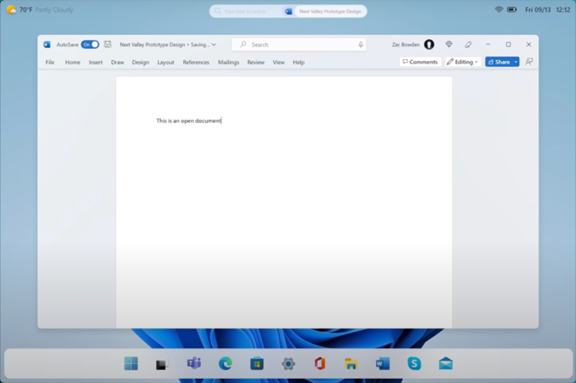 Notez, le Widget de météo au coin supérieur gauche, la recherche au centre et les informations de Wi-Fi, de pile, de date et d’heure à droite. Notez également que la barre de tâches au bas est flottante. Est-ce là une première vue du successeur de Windows 11 ? Possible. Seul l’avenir nous le dira.