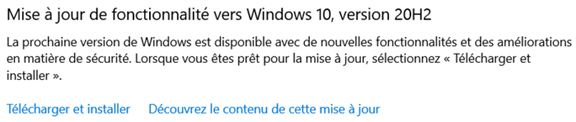 —> Information – Les mises à jour de fonctionnalités de Windows 10 arrivent au printemps et à l’automne. Elles ne sont pas téléchargées et installées automatiquement, vous devez en donner la commande.