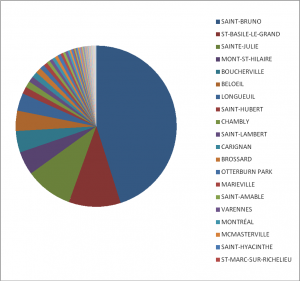 Le club comptait 780 membres à la fin d’avril, et c’est grâce à ses 78 généreux bénévoles que le CIMBCC a pu accomplir sa mission et atteindre ses objectifs. En regardant le graphique qui suit, vous constaterez que plus de 40 % des membres du club habitent Saint-Bruno-de-Montarville et que les autres membres proviennent de 49 autres municipalités. Ces données sont extraites du registre des membres qui est géré par quatre bénévoles.