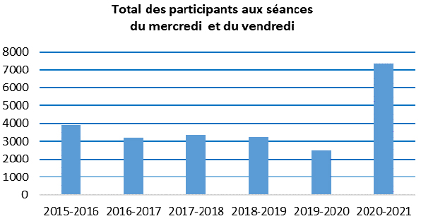 Comme on peut le constater dans le graphique ci-dessous, la participation aux séances du mercredi et du vendredi a dépassé un total de 7 000 connexions différentes en 2020-2021. C’est beaucoup plus qu’en 2015-2016, par exemple, la meilleure des dernières années. Les résultats de 2019-2020 s’expliquent par l’arrêt des activités à la mi-mars 2021, ce qui a eu pour effet d’annuler dix séances.