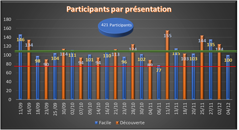 Nous espérions un achalandage moyen de 75 participants par présentation, mais nous en avons obtenu 109 en moyenne pour les 25 présentations de l’automne comme l’indique la ligne verte dans la figure ci-dessous.