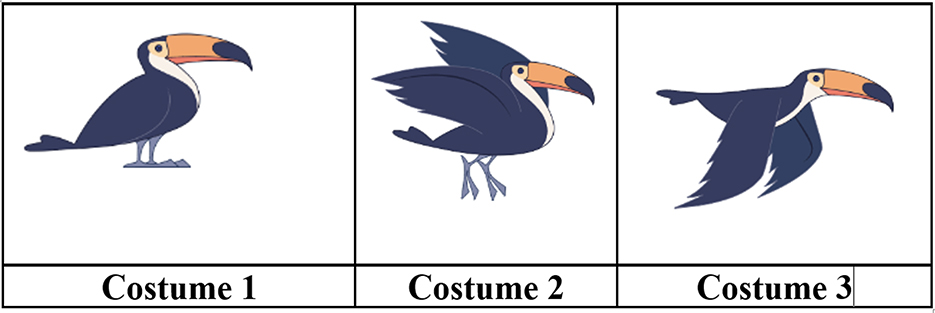 - Lorsque le toucan affiche le costume 2, l’instruction costume suivant remplace le costume 2 par le costume 3.