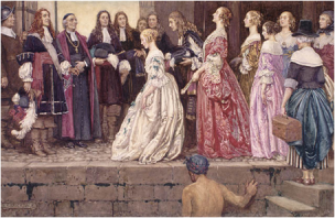 Tableau représentant l’arrivée des Filles du Roy à Québec. Les filles sont reçues par l’intendant Jean Talon et Mgr de Laval (Source Wikipédia).