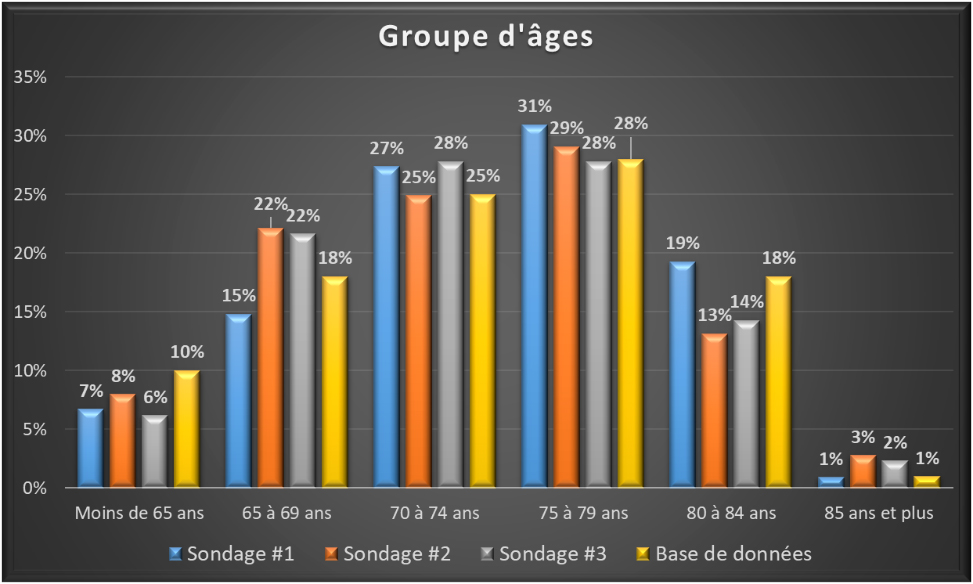 À titre d’exemple, ce graphique sur les groupes d’âge où nous remarquons que les données tirées des trois sondages sont cohérentes avec celles recueillies directement à partir de la base des données des membres du Club.