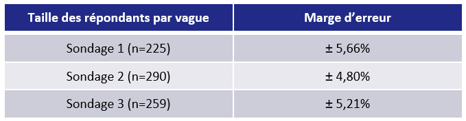 Pour les habitués des sondages, la marge d’erreur statistique a été de ± 5,21% (sondage 3) et ± 4,80% (sondage 2) sur l’échantillon total pour un niveau de confiance de 95%.