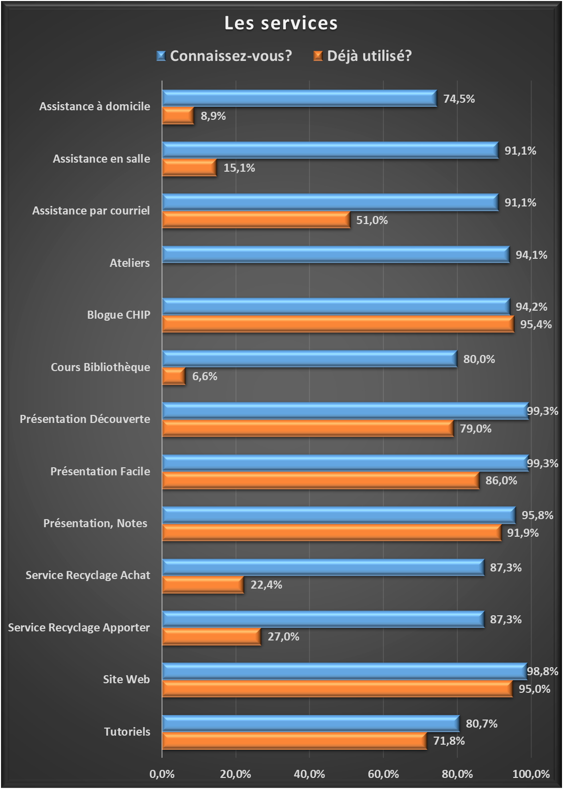 Le principal objectif des sondages 2 et 3 était de constater votre niveau de connaissance et d’utilisation des divers services que vous offre le CIMBCC. Nous avons tenté de résumer le tout en un seul graphique qui, je dois l’avouer, est assez lourd étant donné le nombre de services :