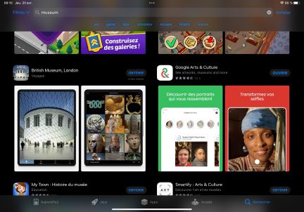 Pour les utilisateurs de tablette Android ou iPad, notez que la plupart de ces visites virtuelles fonctionneront. Toutefois, vous avez accès à plusieurs applications dédiées en fonction des musées via votre magasin respectif d’applications, soit Google Play pour Android ou l’App Store pour iPad. Cependant, celles-ci contiennent souvent des achats intégrés, soyez donc vigilant sur les coûts potentiels. Également, je vous recommande d’effectuer votre recherche avec le terme anglais, soit « museum », celui-ci semble donner généralement de meilleurs résultats que le mot « musée ».