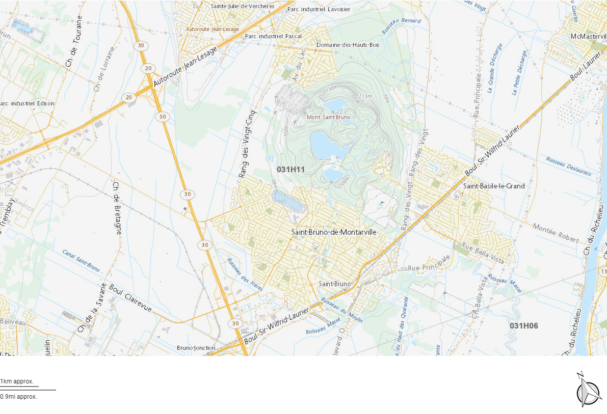 Le mont Saint-Bruno se retrouve sur le feuillet 31H11 du Système national de référence cartographique (SNRC) à l’échelle 1/50 000. Ce genre de carte en version papier peut s’acheter à plusieurs endroits, mais le coût est appréciable.