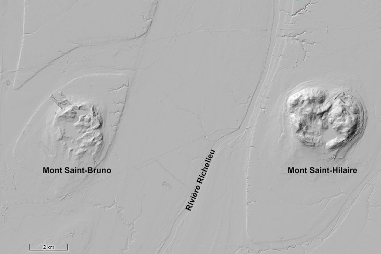 Plusieurs couches d’information sont offertes. Une de celles-ci s’appelle Relief ombré LIDAR (dégradé). La Figure 2, ci-dessous, montre les monts Saint-Bruno et Saint-Hilaire.