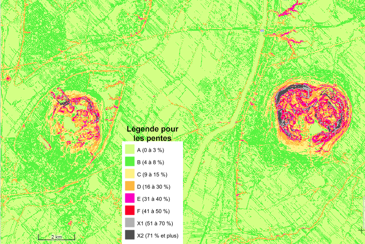 Une autre couche d’information s’appelle Pentes LIDAR (dégradé). Comme le montre la légende de la Figure 3, ci-dessous, les pentes du terrain autour des deux collines montérégiennes sont beaucoup plus raides que dans les plaines environnantes.