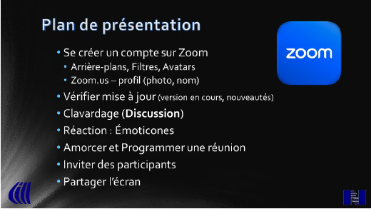 Suivront les actions vraiment de base. Après cette présentation, vous aurez les outils minimaux pour tirer profit d’une réunion en vidéoconférence.