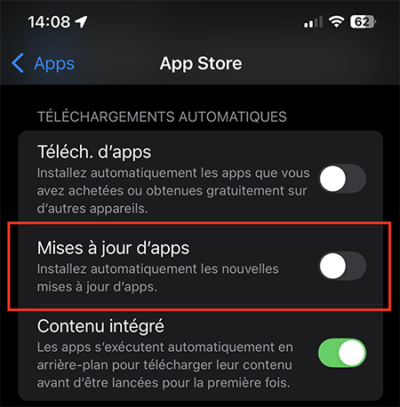 Recherchez Mises à jour d’apps dans la section TÉLÉCHARGEMENTS AUTOMATIQUES. Comme vous pouvez le voir sur l’image suivante, le mien n’est pas activé.