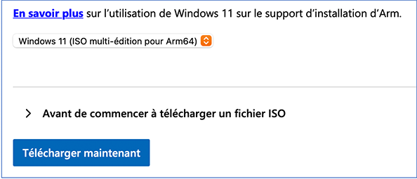 Poursuivons en téléchargeant une version spéciale de Windows 11 prévue pour fonctionner sur architecture ARM que vous retrouverez sur cette page chez Microsoft. À la liste déroulante sur la page en question, choisissez Windows 11 (ISO multi-édition pour Arm64), puis cliquez sur le bouton Télécharger maintenant.