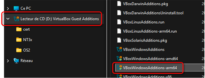 Cliquez sur celui-ci, puis, dans les choix offerts à droite, double-cliquez sur VBoxWindowsAdditions-arm64. Attention de choisir le bon fichier.