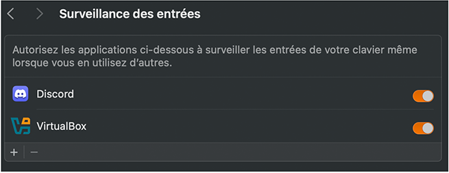Il se peut que vous ayez à accorder une autorisation au niveau de la saisie au clavier. Si tel est le cas, celui-ci se trouve dans les Réglages -> Confidentialité et sécurité -> Surveillance des entrées. Autorisez VirtualBox en activant la case. Un redémarrage de VirtualBox sera nécessaire.