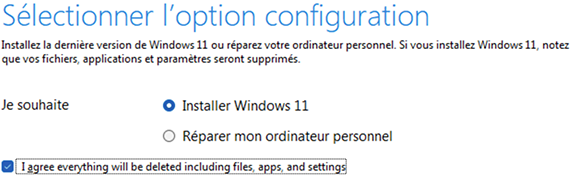 • À la fenêtre suivante, choisissez Installer Windows 11 et cochez la case I agree everything will be deleted including files, apps and settings. Oui, je sais, c’est du vrai “franglais” ! Cliquez le bouton Suivant.